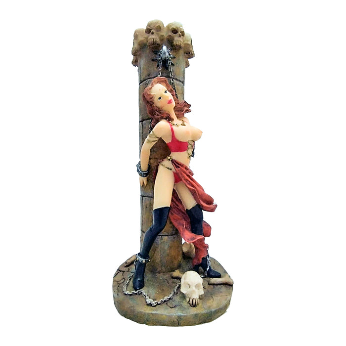 Portacandela con raffigurazione di una donna con abiti succinti, drappo rosso e stivali neri, in ambientazione dark. Un design audace ed esplosivo, per dare un tocco di personalità alla tua casa! Avventurati in un mondo ricco di stile, portando a casa Portacandela Sexy Donna Dark Incatenata! Altezza cm 25. Perfetta decorazione per Halloween.