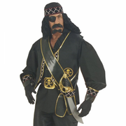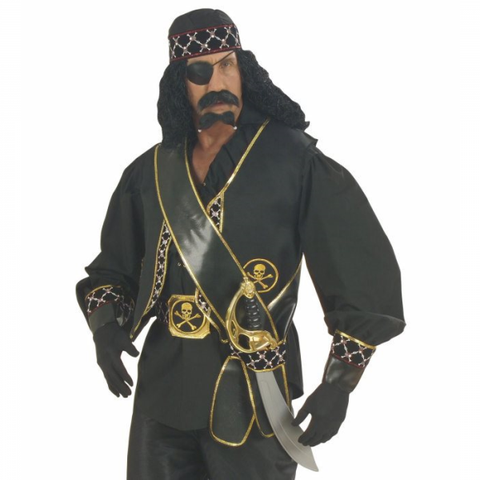Portaspada in similpelle di colore nero con bordature in tessuto di colore oro. La taglia è in misura di adulto. La lunghezza totale è di centimetri 90. I due lembi sono legati uno all'altro da una fascia. Quest'ultima è quella che fungerà da portaspada. Sopra la similpelle sono stampati tanti teschi da pirata. Perfetto accessorio per completare il tuo travestimento da pirata.