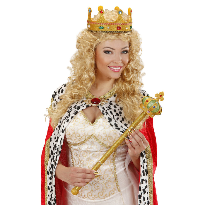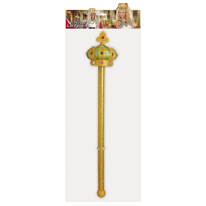 Scintillante scettro per re o regina, perfetto accessorio da tenere in mano durante i festeggiamenti reali. Questo semplice ma prezioso scettro in plastica è interamente rivestito con glitter oro e parte superiore impreziosita con gemme colorate. lo scettro ha una lunghezza totale di circa 55 cm con un diametro nella parte superiore di 10 cm. con decoro verde/oro Anche nel manico sono presenti delle mini gemme colorate. Anche la tua personale casa reale non potrà fare a meno di questo scettro!