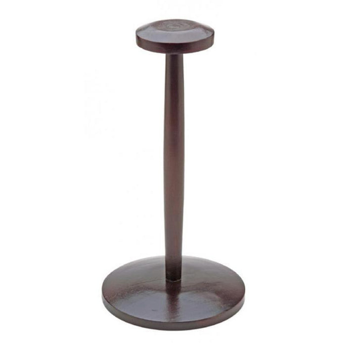 Supporto in legno levigato per sostenere ed esporre riproduzioni di elmi. Altezza centimetri 35. Il legno è marrone di finitura lucida.