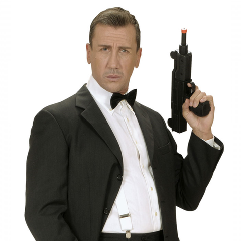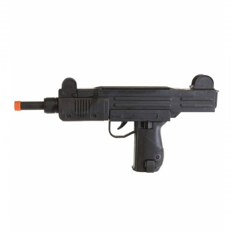 Mitra in plastica nera modello Uzi con particolari suoni di raffica. Le dimensioni sono: lunghezza centimetri 36. Da considerarsi arma giocattolo, in quanto provvista dell'apposito tappo, di colore rosso, posto sulla canna.