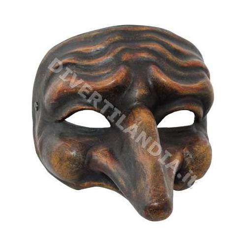 Maschera Veneziana Zanni in cartapesta, caratterizzata, come la maggior parte degli Zanni dal lungo naso. La base è in cartapesta colorata in color cuoio, curioso il dettaglio delle rughe sopra il naso. Maschera veneziana classica, usata nella Commedia dell'Arte e nel Carnevale di Venezia.