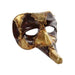 Maschera Veneziana Zanni, con la classica caratteristica del naso molto pronunciato, realizzata in cartapesta e stucco e resa originale dal motivo a scacchi oro e cuoio. Completa il quadro di questa magnifica maschera Veneziana il motivo a note musicali.