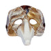 Maschera Veneziana Zanni, con la classica caratteristica del naso molto pronunciato, realizzata in cartapesta e stucco e resa originale dal motivo a scacchi oro, bianco e rosso. Completa il quadro di questa magnifica maschera Veneziana il motivo a note musicali.